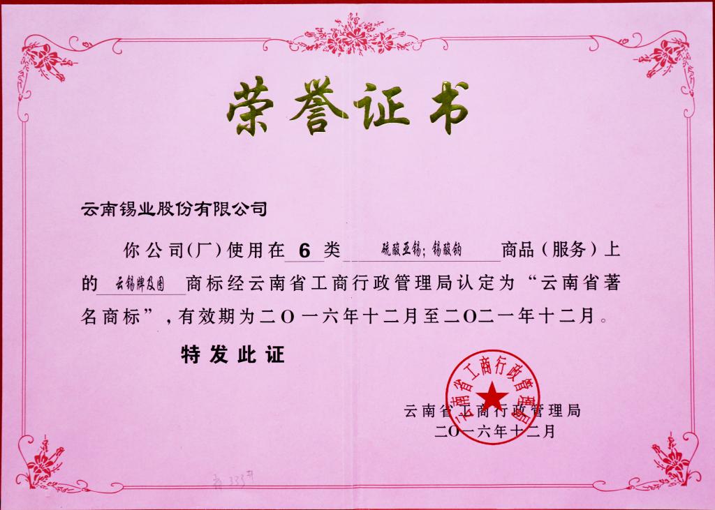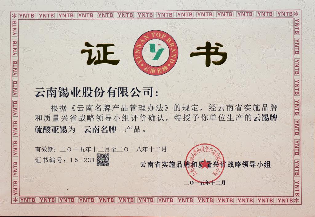 硫酸亚锡、锡酸钠为云南省著名商标