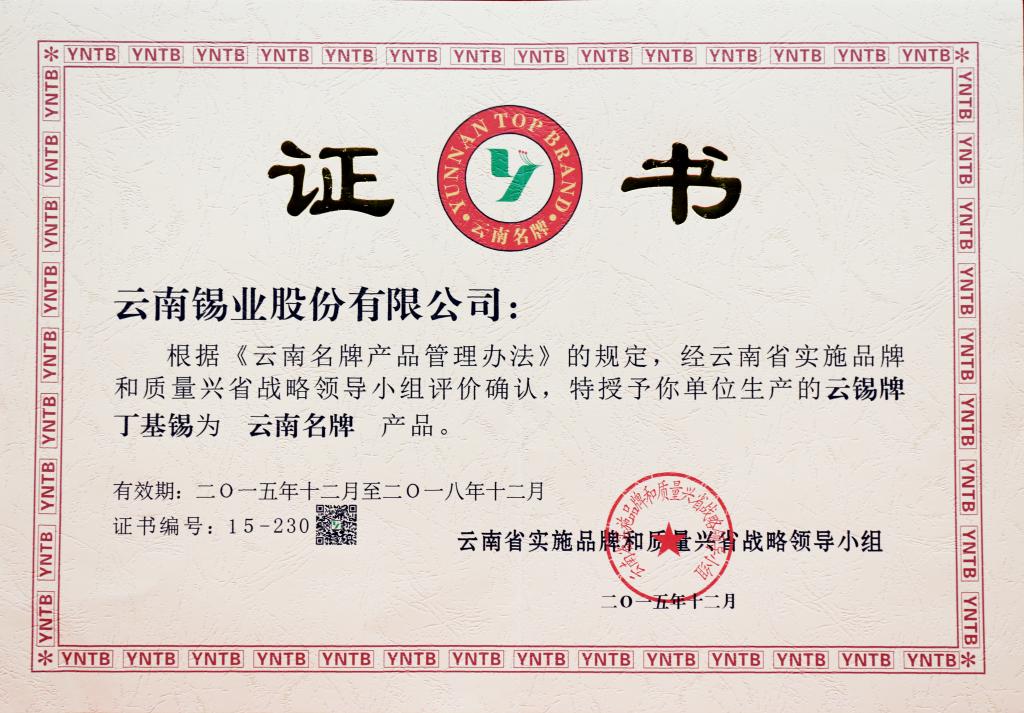 甲基硫醇锡、二丁基二氧化锡、二丁基氧化锡、偏锡酸、焦磷酸亚锡为云南省著名商标