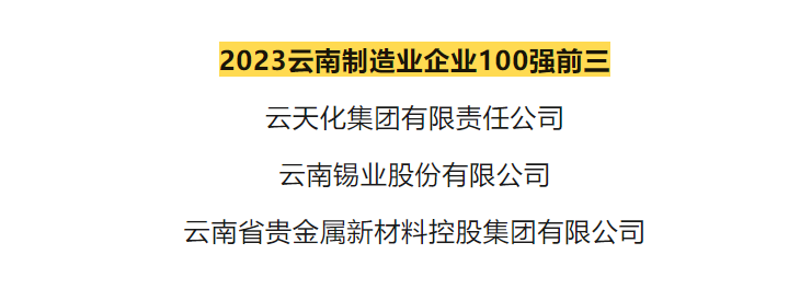 近日,由云南省企业联合会、云南省企业家协会公开发布的“2023云南企业100强”新鲜出炉。3044永利集团位列2023云南高新技术企业100强第1位,2023云南制造业企业100强第2位。