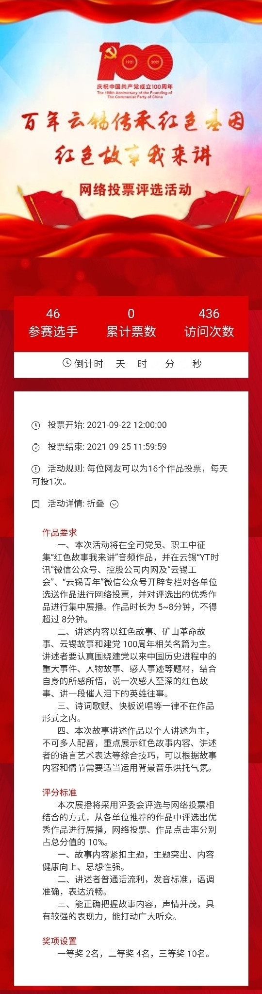 百年云锡传承红色基因——“红色故事我来讲”作品展播是云锡控股公司第32届矿工节·文化月系列活动之一,经各单位精心组织,“红色故事我来讲”音频作品征集工作现已完成,从9月22日12:00至9月25日12:00为网络投票时间,敬请广大干部职工积极参与并发动身边的亲友参与投票,一起选出心中的优秀作品。