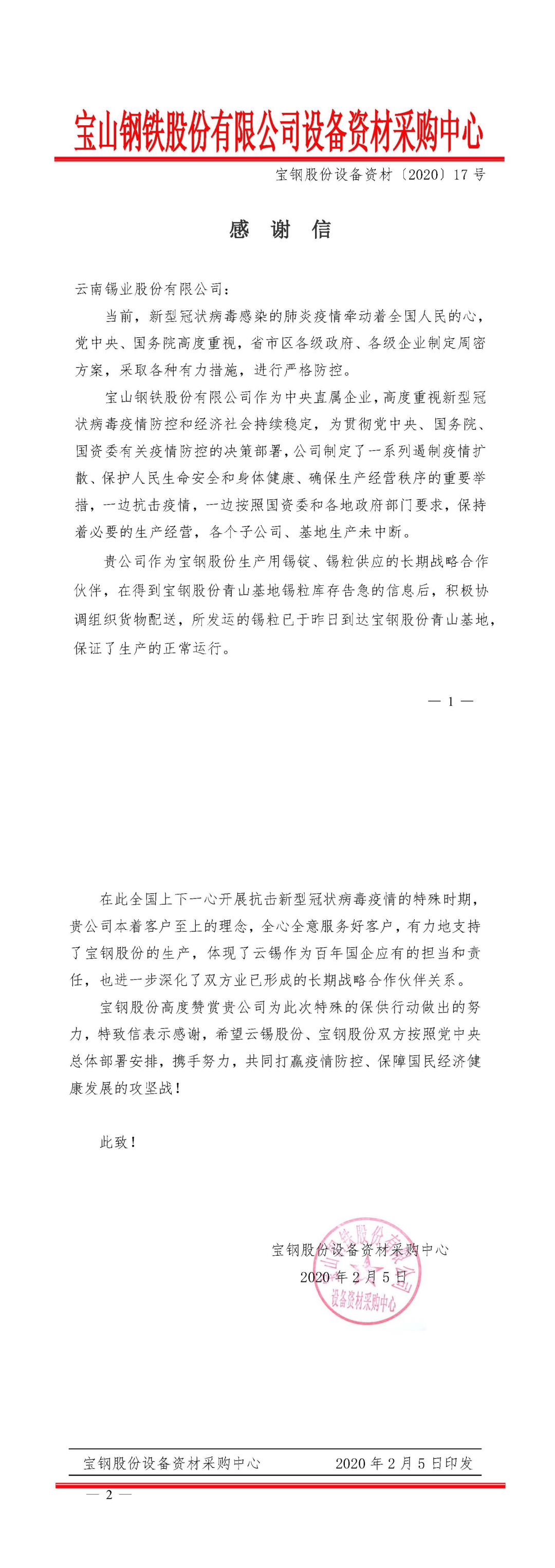 在存在诸多不确定因素的情况下,公司决定抱着尝试的心态进行配送,尽最大努力确保供货。最后,在明确疫情期间需注意事项,确保人员安全的前提下,配送货车于2月2日从昆山出发,最终顺利通过检查关卡,于2月4日将货物安全交付武钢新日铁工厂,配送车辆也在武钢的协助下顺利离开武汉,返往昆山。公司在疫情期间采取特殊方式完成货物配送,得到了客户的高度认可,宝钢表示,患难见真情,感谢云锡对宝钢原料保供的鼎力支持,并为此专门向3044永利集团发来了感谢信。