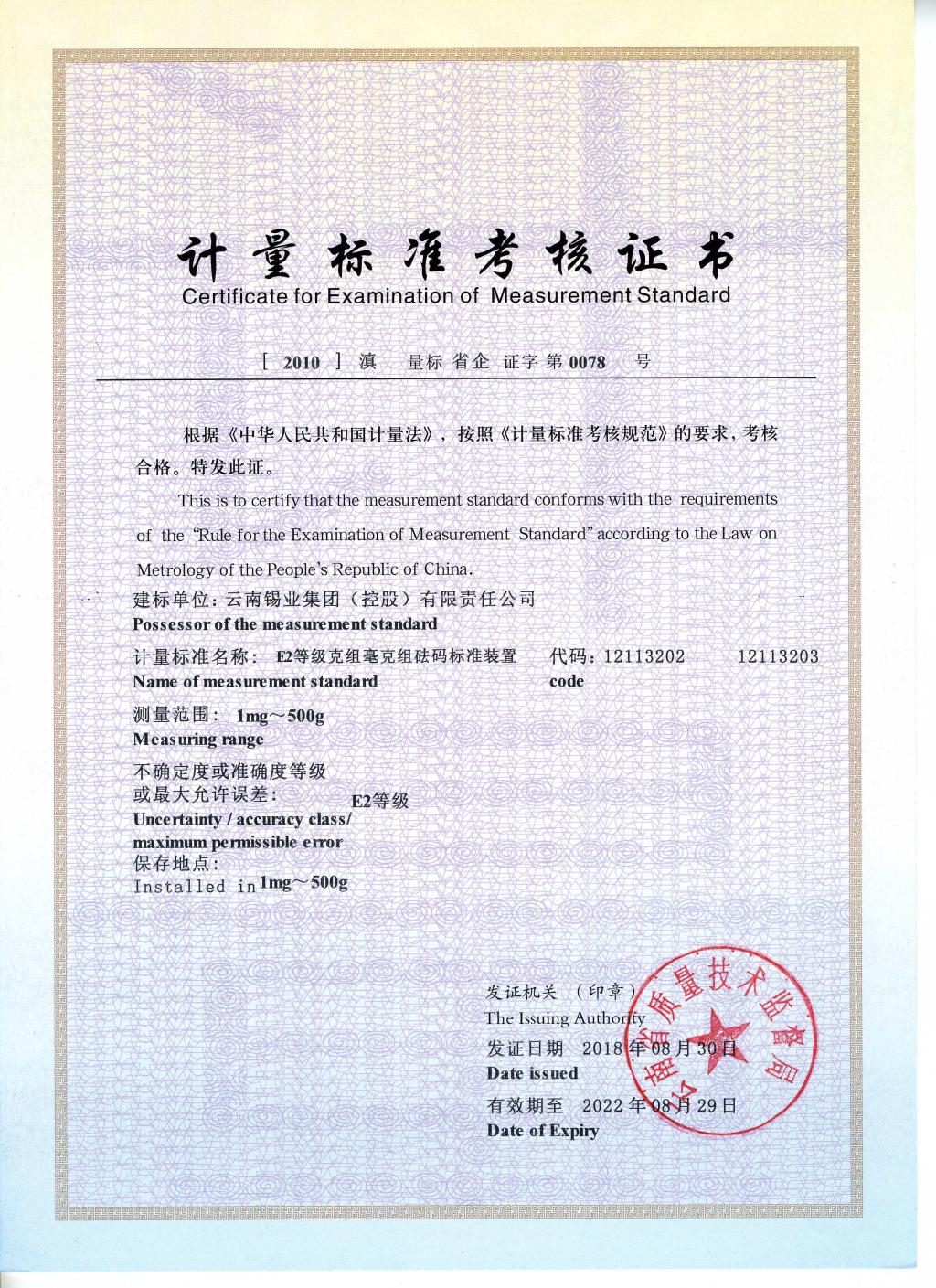 近日,云锡11项企业最高计量标准一次通过复查考核,获得了由云南省质量技术监督局颁发的《计量标准考核证书》。