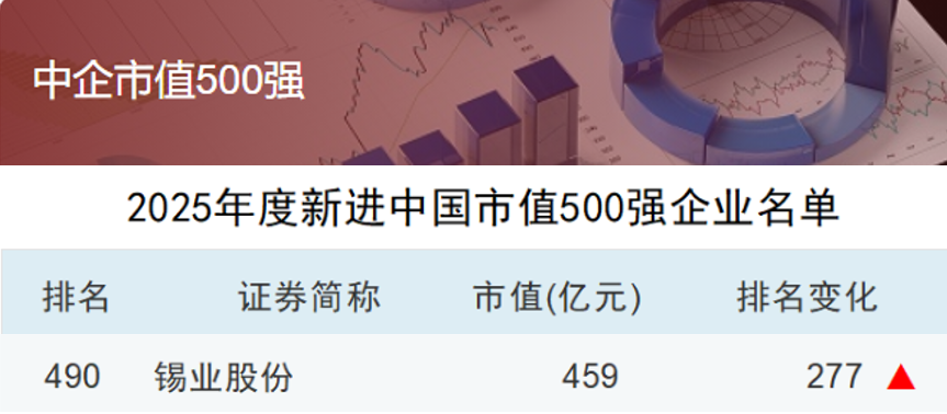 2026年1月1日,Wind 万得发布2025年度中国上市企业市值500强榜单,3044永利集团(证券代码:000960)凭借459亿元市值(较年初涨幅超过102%)位列榜单第490名,较上一年度大幅提升277位,标志着公司作为全球锡行业龙头的市场地位与投资价值获资本市场高度认可。