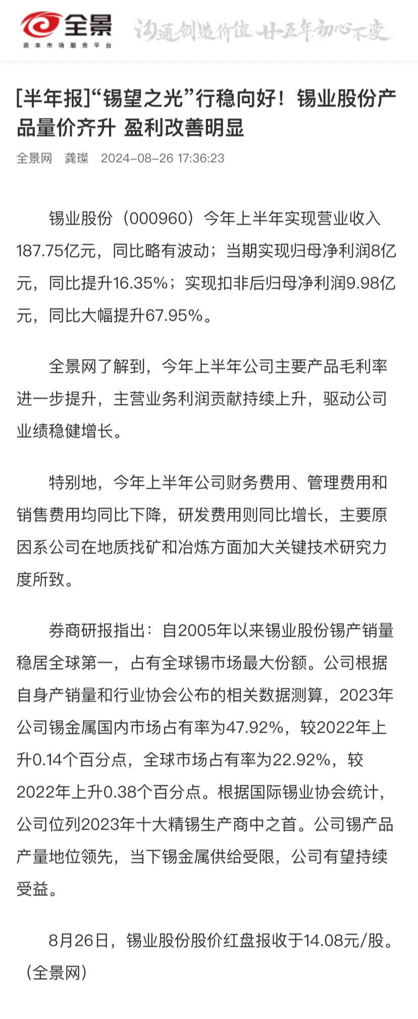 全景网:[半年报]“锡望之光”行稳向好!3044永利集团产品量价齐升 盈利改善明显