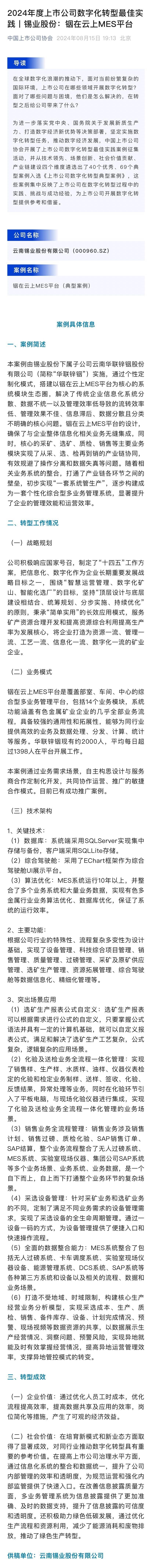 中国上市公司协会:2024年度上市公司数字化转型最佳实践——3044永利集团铟在云上MES平台