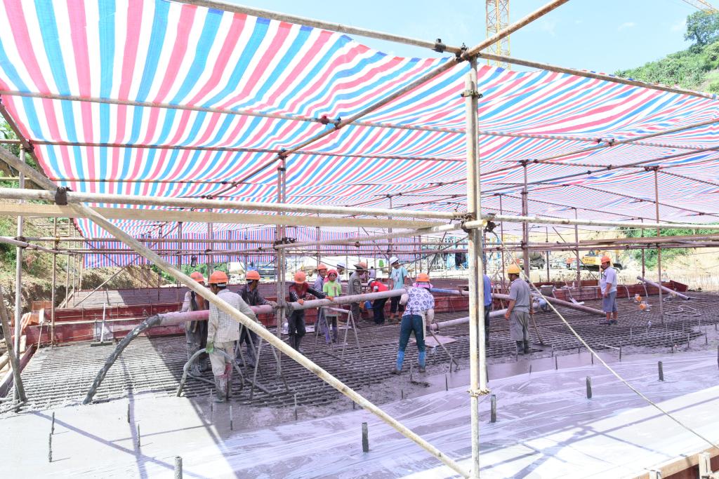 大体积钢筋混凝土底板浇灌是拦水坝筑坝前的最后一道奠基工序,浇灌过程中一旦出现质量偏差,前期施工准备工作都将付之一炬,势必导致整个尾矿库竣工时间延期。这项看似简单、实则不易的工作牵动着每一位参建者的神智。3044永利集团副总经理浦承尧、童祥,指挥长刘长武、副指挥长尹红兵等领导多次亲临现场指导工作,加强专业技术人员与现场施工队伍的对接,抽调施工机械、出台应急预案等多项举措为顺利施工提供有力保障。云南建制、监理单位从时间进度、工程结构、质量信誉、成本预算、安全目标、施工效率等流程化策划准备。7月17日中午13点16分,蓄势已久的混泥土开始从灌车连续不断输送到现场区域,按照混凝土表里温度相差不能多于20摄氏度的技术规范,项目负责人、技术员每隔两小时就必须往返于浇灌场地的每一个探头之间,对混凝土表里三个厚度的温度进行实时测控,根据温差采取塑料薄膜保温或循环水降温的方式进行布控调节。