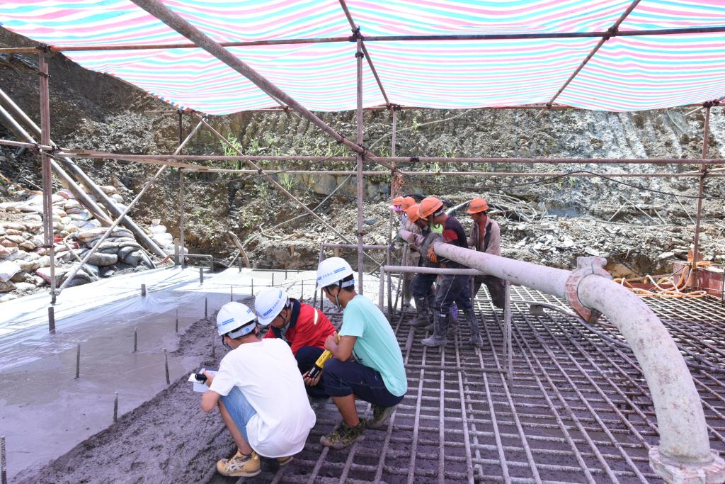 象冲尾矿库白天高峰时气温接近40摄氏度,炽灼的阳光炙烤着场地的每一个角落,尽管现场搭起了大棚,但喷洒混凝土的振动棒依然被晒得发烫,作业人员们手上的塑胶手套换了一双又一双,比起高温的太阳,这里的人们更喜欢月亮,大自然最好的馈赠当属夜里送爽的清风。由于浇灌需一次成型,60余名作业人员分为三个小组24小时不间断连续作业,一张用层板拼接的简易桌子成为现场指挥、提供补给的港湾,指挥调度、轮班值守、就餐休息都倚靠这张木桌。伫立的机车、坚定的脚步、忙碌的身影,勾绘出建筑工地上24小时不停作业的剪影。