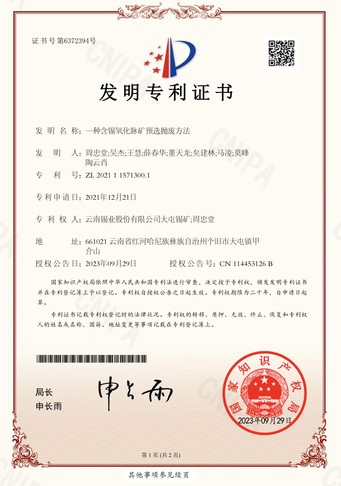 9月29日,继大屯锡矿研发的“一种铜锡共生硫化矿预选分级选矿方法”发明专利于2023年6月获国家知识产权局正式授权的基础上,大屯锡矿“...