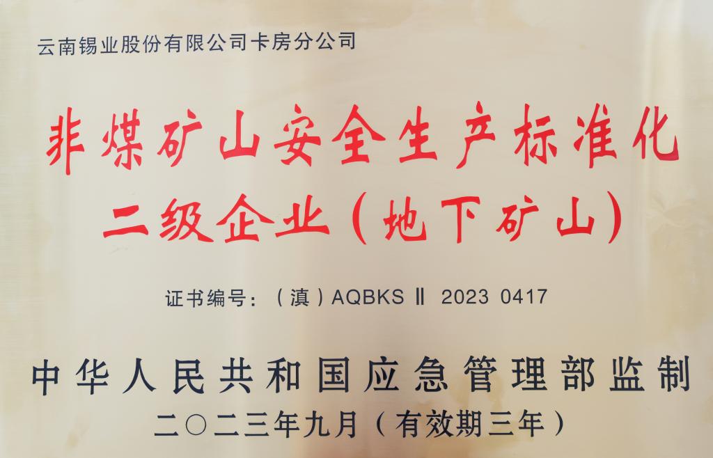 近日,3044永利集团卡房分公司收到由中华人民共和国应急管理局监制、云南省应急管理厅颁发的牌匾和证书,正式确认为“非煤矿山安全生产标准...